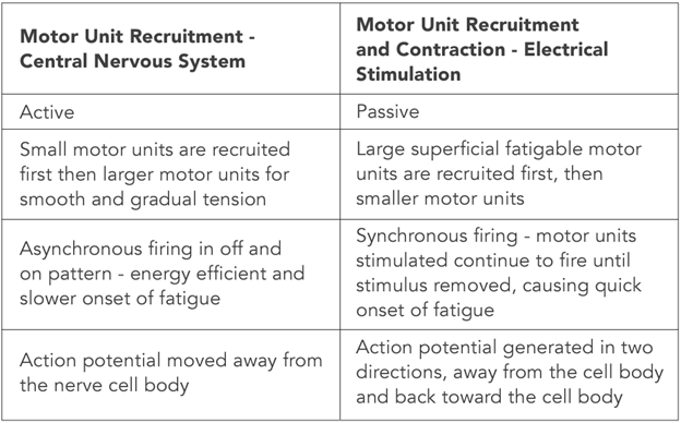 Table 1. Difference between a contraction elicited through normal CNS function as compared to that elicited via electrical stimulation means.