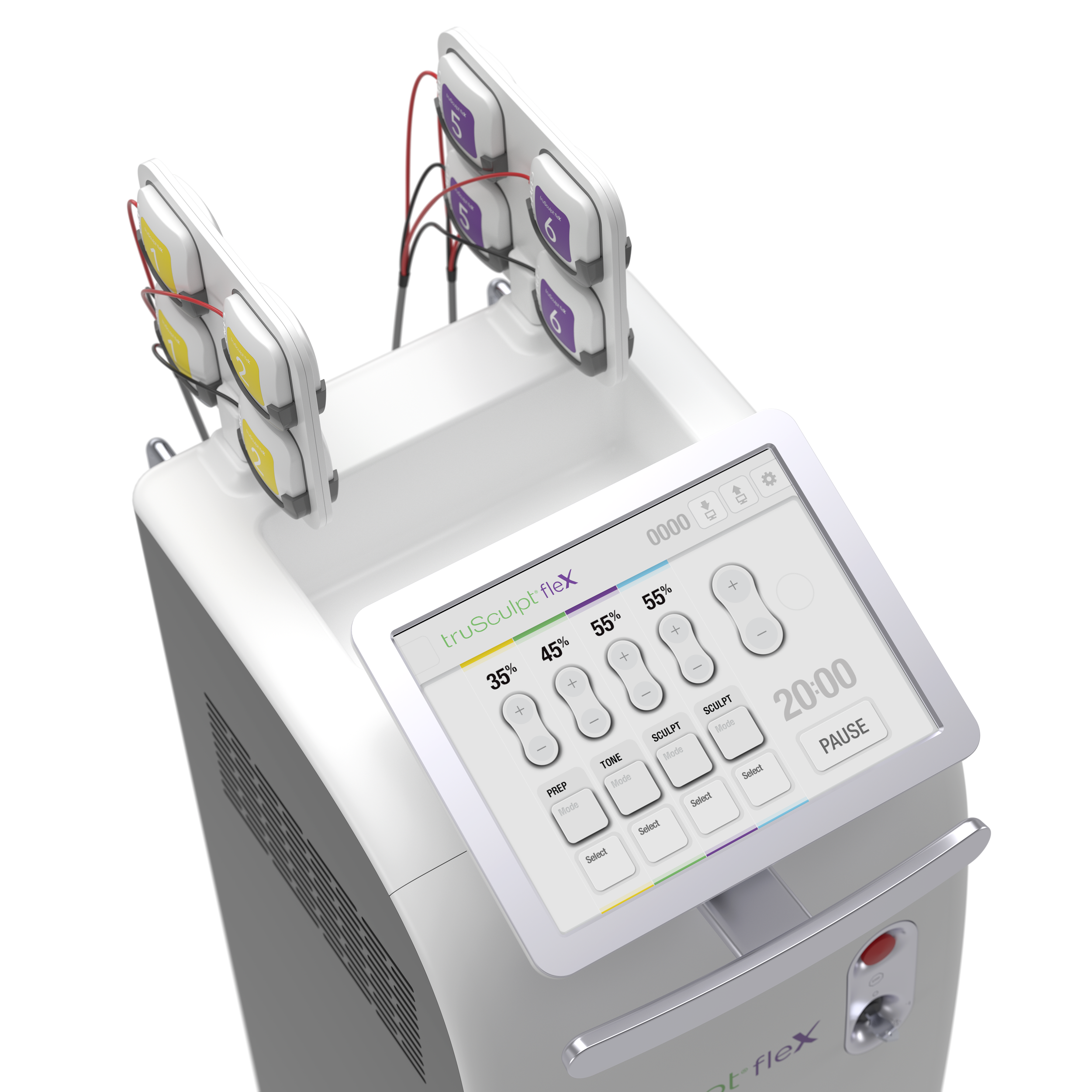 The TruSculpt Flex is a bio-electric current stimulation device that incorporates direct electrical muscle stimulation which can contract a specific muscle or muscle group, well and above what would be tolerated with a traditional electrode pad. The TruSculpt Flex improves abdominal tone, for strengthening abdominal muscles, and for development of a firmer abdomen. In addition to strengthening, toning, and firming of the buttocks and thighs. The device consists of four core electrode cables which power sixteen handpieces. The handpieces are placed on the body to allow simultaneous treatment of up to eight areas.